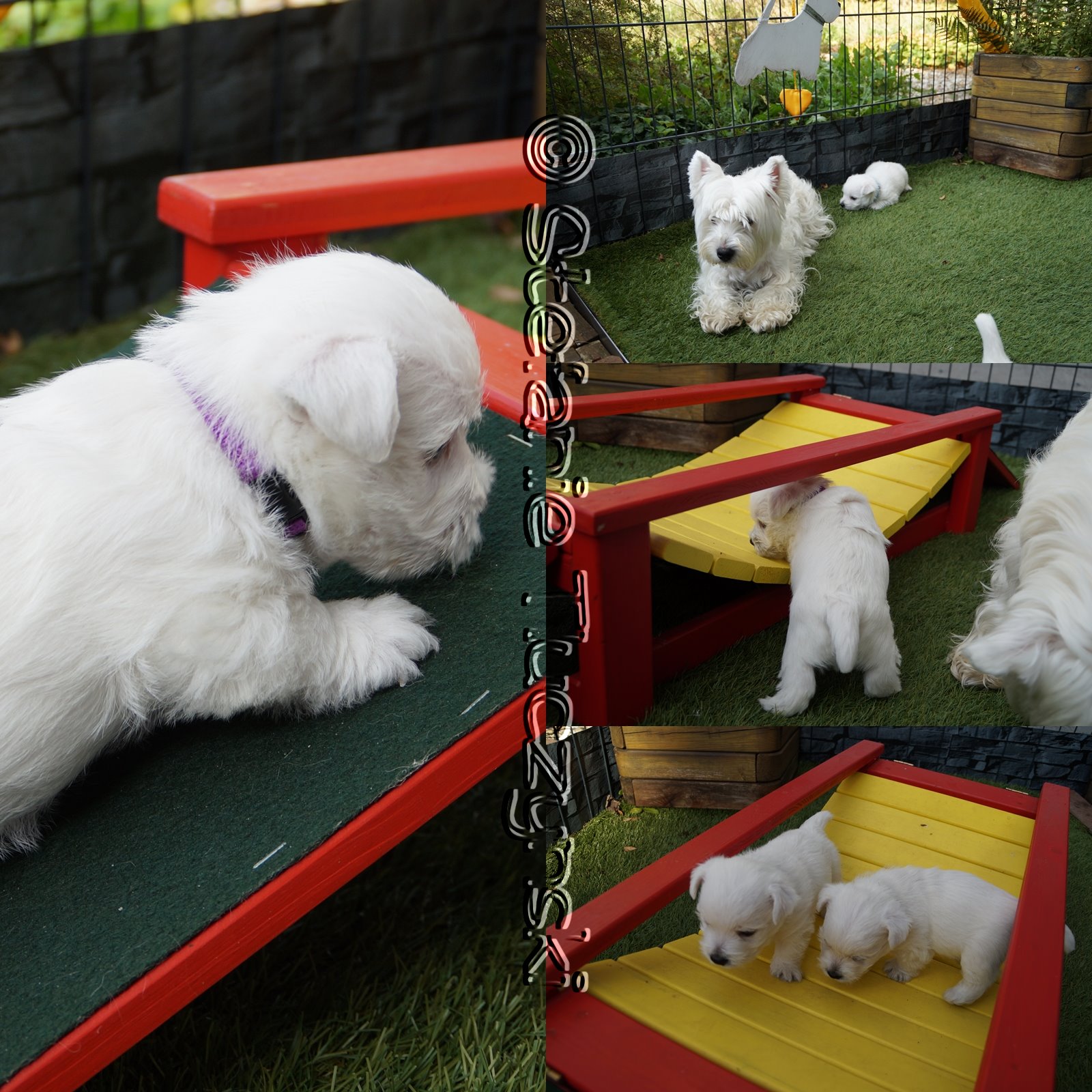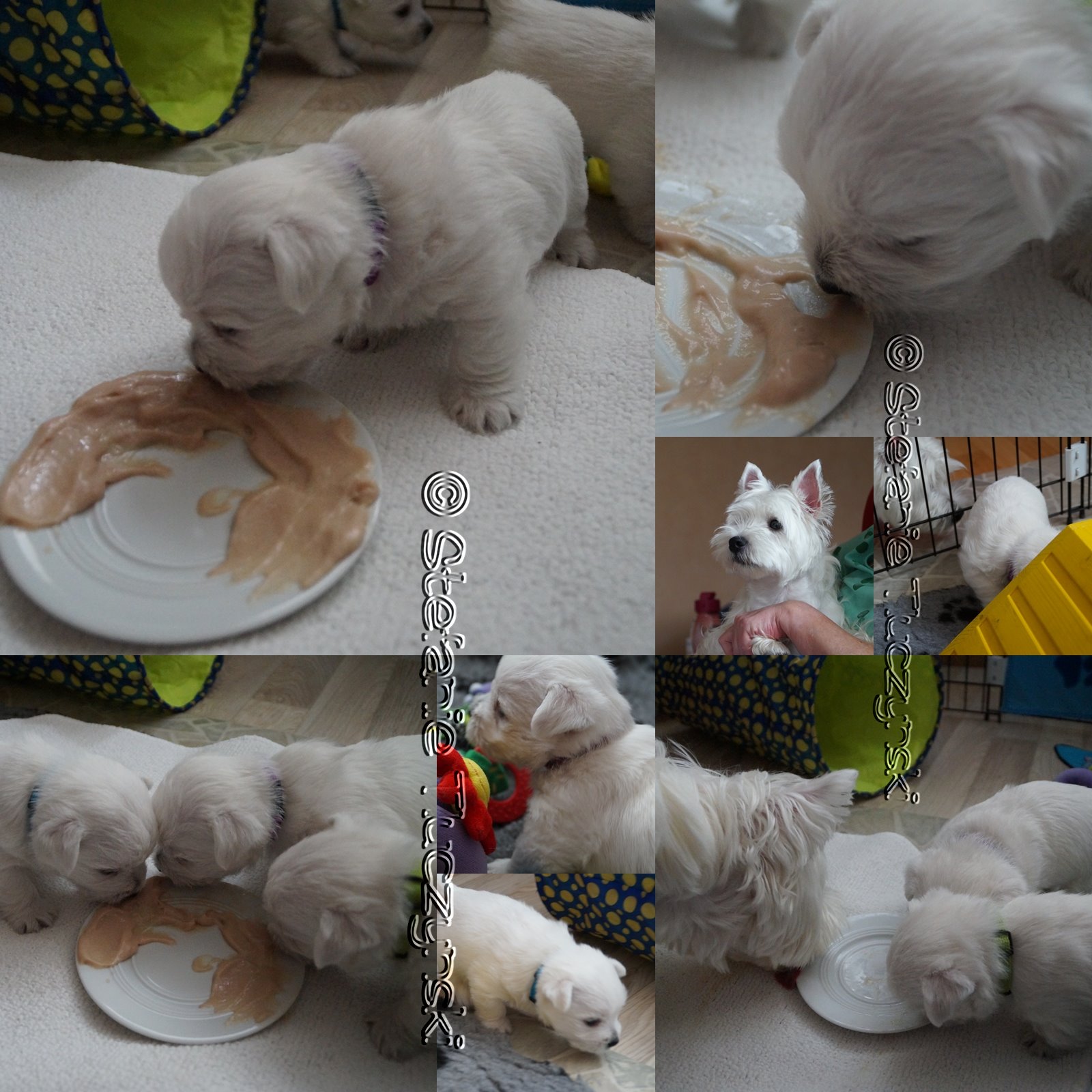 Nein, bei uns pfeift nicht das Schwein, sondern die Züchtermama, wenn es den weißen Teller mit den leckeren Sachen gibt. Wenn der Pfiff ertönt, dann musst du deine Beine in die Hand nehmen und zum Teller rennen, eigentlich ganz einfach. Aber ich sage es euch, meine Brüder sind schwer von Begriff. Es pfeift und nichts passiert, da wundern sie sich, dass ich so viel zum Fressen bekommen. Tja, wenn man die Regeln nicht kennt ist man selbst Schuld, wenn man nichts abbekommt. Wahrscheinlich ist das Problem das Geschlecht. Leider habe ich noch keine echten Westiemännner getroffen. Aber der weiße Blitz und die Uroma sind auch etwas mopsig, deshalb glaube ich, dass wir Frauen einfach intelligenter sind, wenn es ums Essen geht.